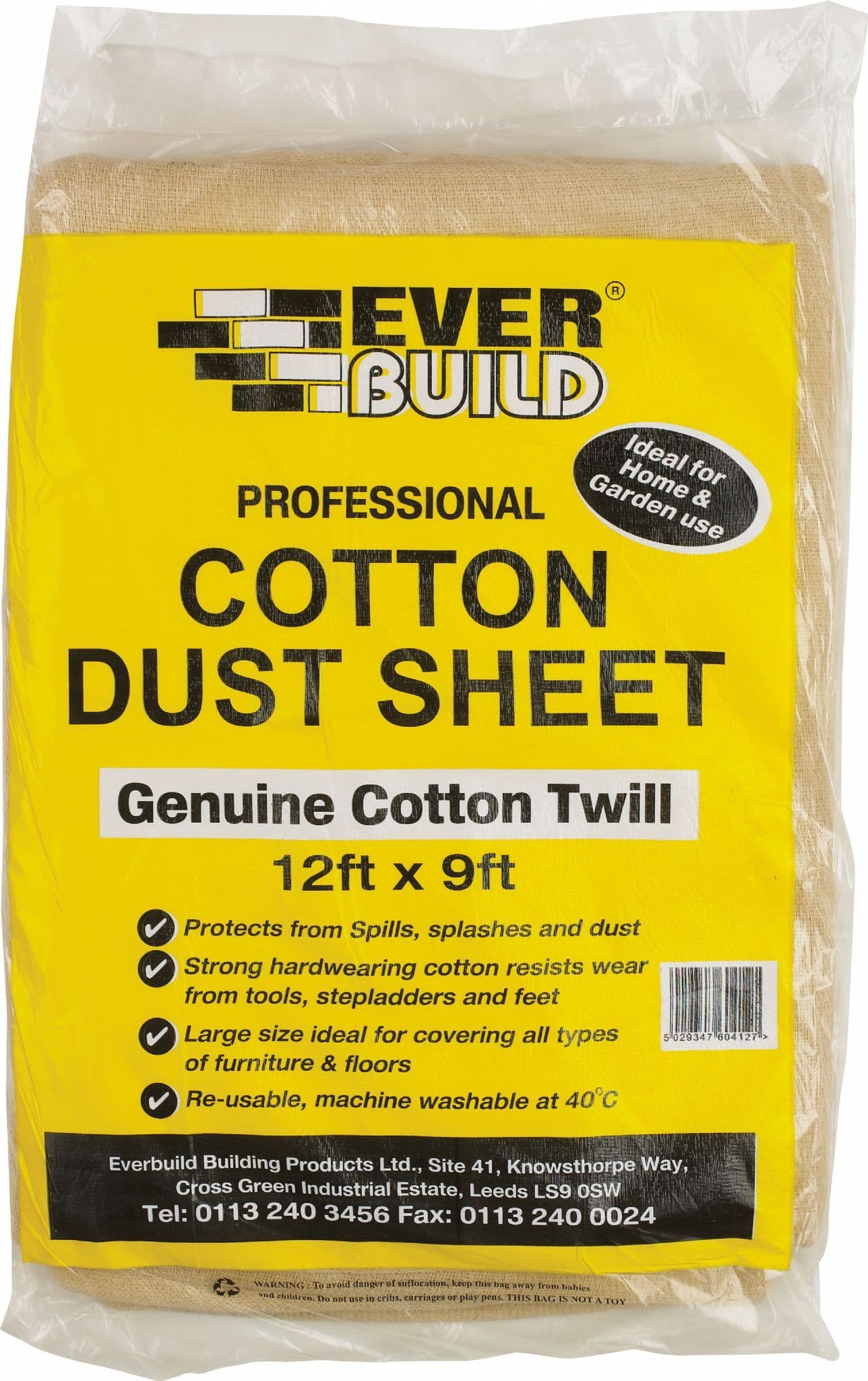 Genuine cotton twill, protect from spills, splashes and dust. Strong hardwearing cotton resists wear from tools, stepladders and feet. Reversible, machine washable.