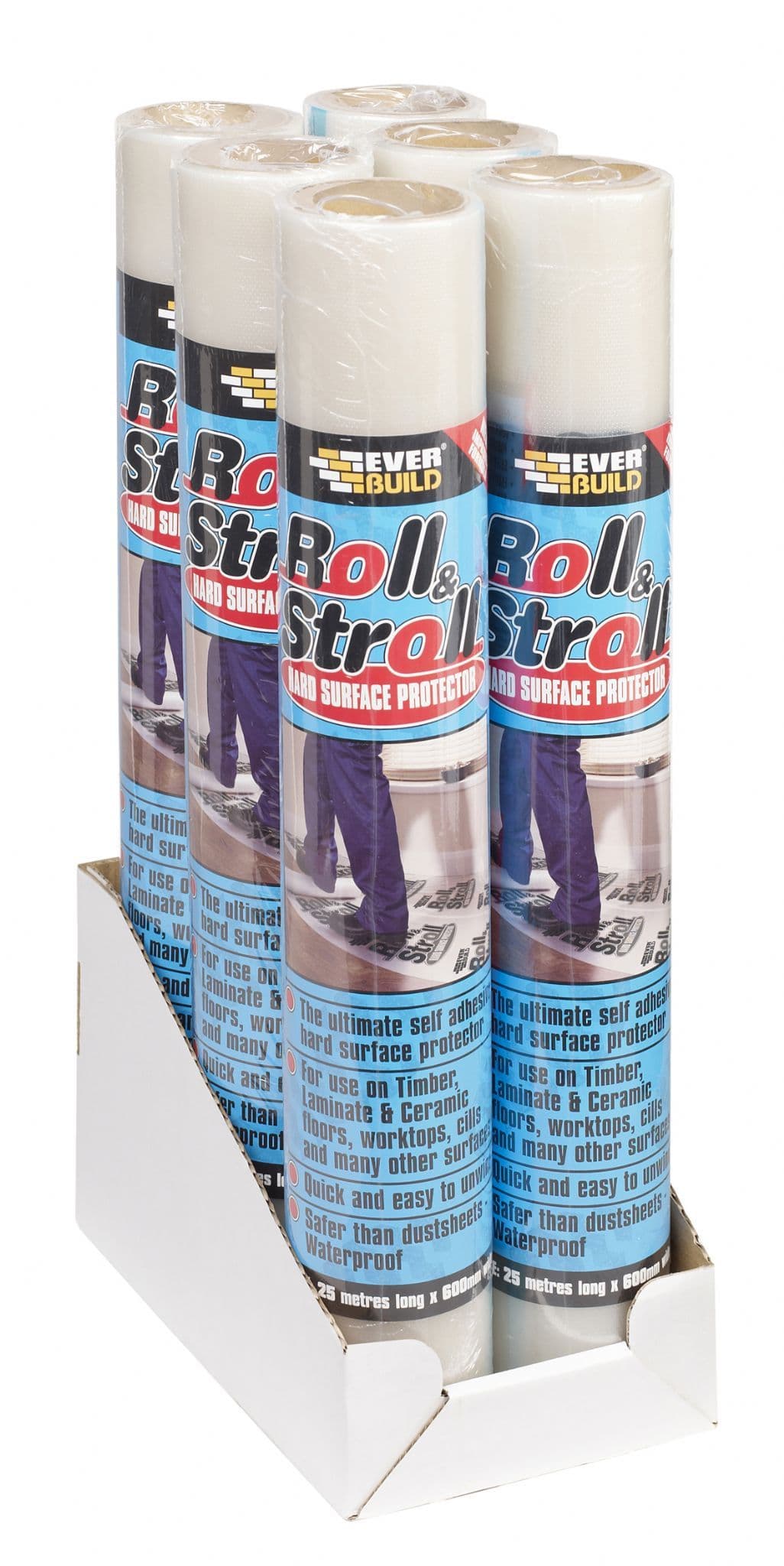 Roll & Stroll Hard Surface Protector is the ultimate self adhesive floor protection, works on all hard surfaces such as timber, laminate, ceramic floors, worktops. With the adhesive coating on the outside it is easy to unwind, safer than dust sheets and has a multitude of uses, protects against spillage and won’t tear or rip.